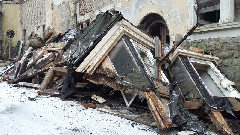 September 2020Stropy všetkých troch poschodí hotovéSpadnutý arkier znovu stojíProjekt dočasného zastrešenia schválený